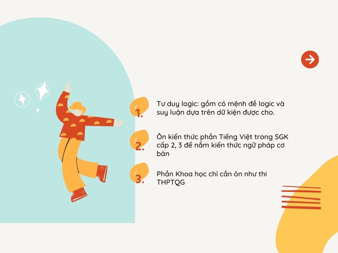 • Toán học: toán THPT ở mức độ cơ bản, chỉ cần áp dụng công thức, chú ý bài toán xác suất.