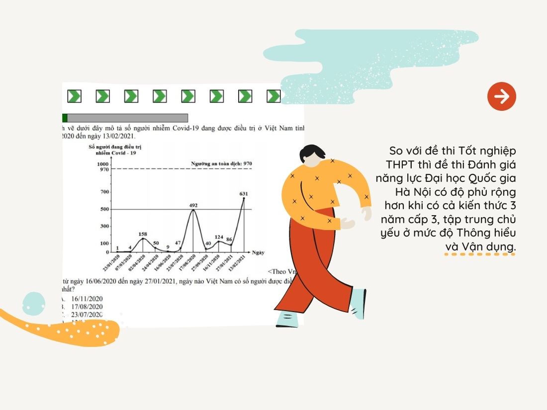 So với đề thi Tốt nghiệp THPT thì đề thi Đánh giá năng lực Đại học Quốc gia Hà Nội có độ phủ rộng hơn khi có cả kiến thức 3 năm cấp 3, tập trung chủ yếu ở mức độ Thông hiểu và Vận dụng.