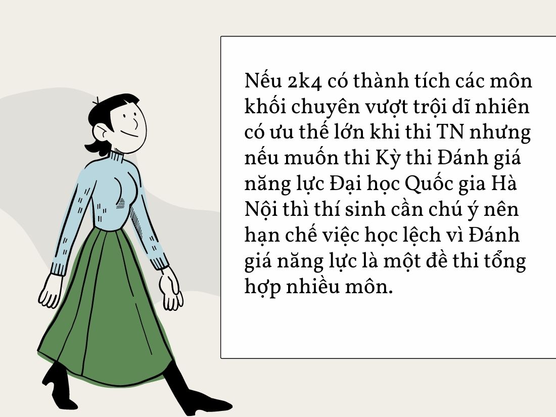 Kỳ thi Đánh giá năng lực Đại học Quốc gia Hà Nội khác với đề thi THPTQG vì Đánh giá năng lực Đại học Quốc gia Hà Nội xét tuyển dựa trên tổng điểm một bài thi bao gồm cả kiến thức tự nhiên và xã hội, trải đều các môn. Nếu 2k4 có thành tích các môn khối chuyên vượt trội dĩ nhiên có ưu thế lớn khi thi TN nhưng nếu muốn thi Kỳ thi Đánh giá năng lực Đại học Quốc gia Hà Nội thì thí sinh cần chú ý nên hạn chế việc học lệch vì Đánh giá năng lực là một đề thi tổng hợp nhiều môn.