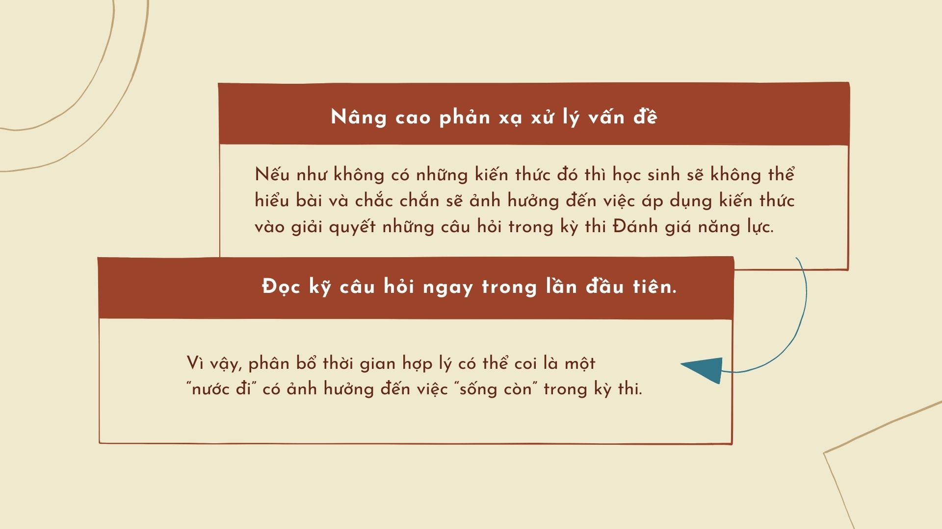 Chính vì, lời khuyên trong trường hợp này là cần phải đọc thật kỹ câu hỏi ngay trong lần đầu tiên, nắm các mấu chốt quan trọng trong đề (note lại, gạch chân, đánh dấu,…) , để không phải đọc lại câu hỏi 2, 3 lần. Thời gian tiết kiệm có thể tập trung vào phương pháp tính toán để đưa ra lời giải.