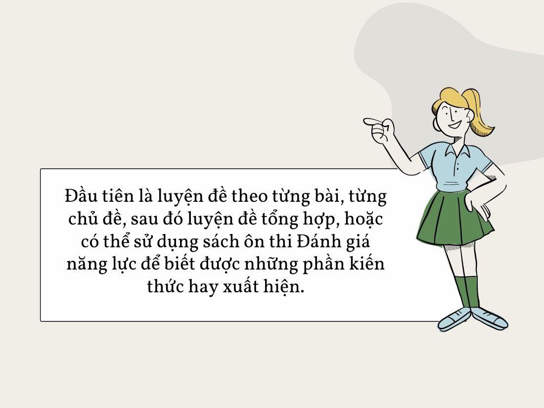 Sơ đồ hóa kiến thức là một cách tổng kết và ôn tập kiến thức hiệu quả, các thí sinh nên tổng kết hết tất cả kiến thức của môn học và ôn tập theo từng chuyên đề, việc này sẽ giúp các bạn nắm được kiến thức cơ bản, biết được bản chất và vận dụng được những kiến thức dã học vào giải quyết vấn đề. Trên cơ sở kiến thức đã học, các em hãy vận dụng để luyện đề trắc nghiệm. Đầu tiên là luyện đề theo từng bài, từng chủ đề, sau đó luyện đề tổng hợp, hoặc có thể sử dụng sách ôn thi Đánh giá năng lực để biết được những phần kiến thức hay xuất hiện.