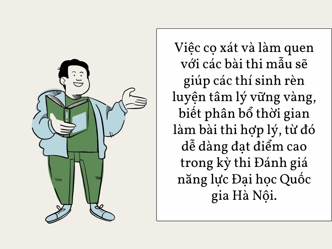 Việc cọ xát và làm quen với các bài thi mẫu sẽ giúp các thí sinh rèn luyện tâm lý vững vàng, biết phân bổ thời gian làm bài thi hợp lý, từ đó dễ dàng đạt điểm cao trong kỳ thi Đánh giá năng lực Đại học Quốc gia Hà Nội.