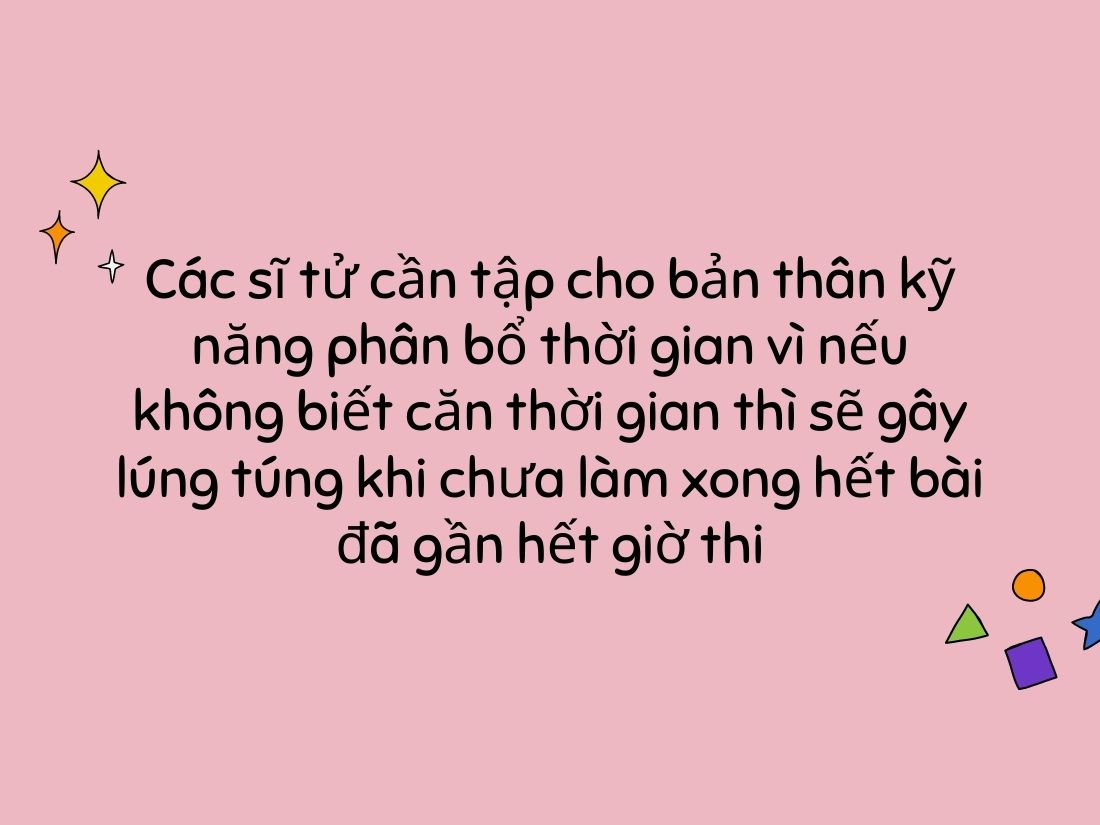 Các sĩ tử cần tập cho bản thân kỹ năng phân bổ thời gian vì nếu không biết căn thời gian thì sẽ gây lúng túng khi chưa làm xong hết bài đã gần hết giờ thi. Để tối ưu hóa thời gian, các bạn cần phân bổ thời gian tốt tùy theo phương pháp học tập của từng người hoặc có thể làm theo một cách chung mà nhiều sĩ tử áp dụng đó là làm câu dễ trước, phần khó để sau.