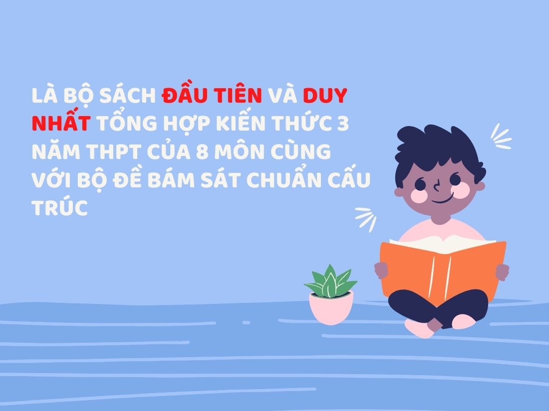 - Là bộ sách ĐẦU TIÊN và DUY NHẤT tổng hợp kiến thức 3 năm THPT của 8 môn cùng với bộ đề bám sát chuẩn cấu trúc đề Đánh giá năng lực ĐHQG TP. Hồ Chí Minh.