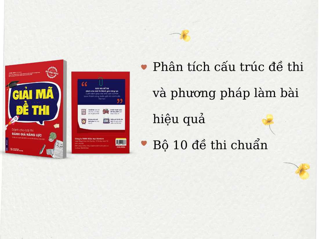Ngoài ra còn có cuốn "Tăng tốc luyện đề Đánh Giá Năng lực Hồ Chí Minh" cuốn sách phù hợp dành cho các bạn đang muốn luyện đề với bộ 10 đề được biên soạn bám sát kiến thức đề thi Đánh Giá năng lực do Đại học Quốc Gia Hồ Chí Minh tổ chức. Mỗi bộ đề sẽ gồm cả đáp án và hướng dẫn giải chi tiết cho các bạn.