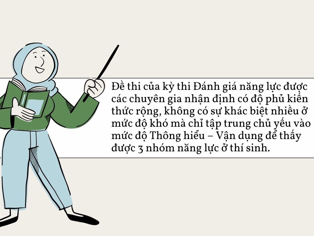 Đề thi của kỳ thi Đánh giá năng lực được các chuyên gia nhận định có độ phủ kiến thức rộng, không có sự khác biệt nhiều ở mức độ khó mà chỉ tập trung chủ yếu vào mức độ Thông hiểu – Vận dụng để thấy được 3 nhóm năng lực ở thí sinh: sáng tạo – giải quyết vấn đề, năng lực Toán học – tiếng Việt – tư duy ngôn ngữ - xử lý số liệu, kiến thức khoa học tự nhiên – xã hội - ứng dụng công nghệ. Nhìn chung, đề thi kỳ thi Đánh giá năng lực Đại học Quốc gia Hà Nội có độ khó nhỉnh hơn đề tốt nghiệp, căn cứ vào tỉ lệ câu hỏi vận dụng và vận dụng cao. Độ phủ kiến thức tương đương nhưng kỳ thi Đánh giá năng lực có nhiều dạng câu hỏi mới lạ yêu cầu học sinh phải bình tĩnh, không lúng túng khi gặp những dạng câu này.