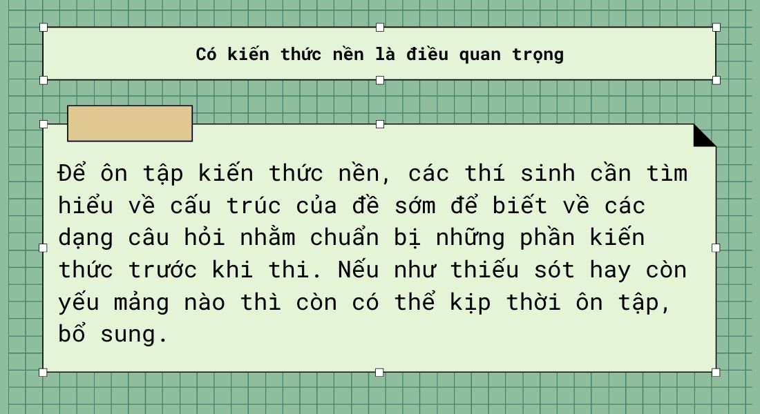 Để ôn tập kiến thức nền, các thí sinh cần tìm hiểu về cấu trúc của đề sớm để biết về các dạng câu hỏi nhằm chuẩn bị những phần kiến thức trước khi thi. Nếu như thiếu sót hay còn yếu mảng nào thì còn có thể kịp thời ôn tập, bổ sung.